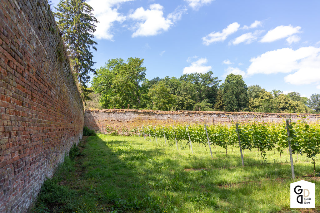 Een deel van de riesling van Gloire de Duras wordt geteeld in de oude, ommuurde moestuin van het Kasteel van Duras. Deze unieke clos van slechts 80 are creëert een microklimaat dat de 'Riesling Clos de Duras' zijn ongekende karakter geeft. Het is een complexe, volle wijn met houtrijping die met een puntje restzoet gebotteld werd. Heerlijk bij oosterse gerechten, gevogelte en kazen met roodflora.