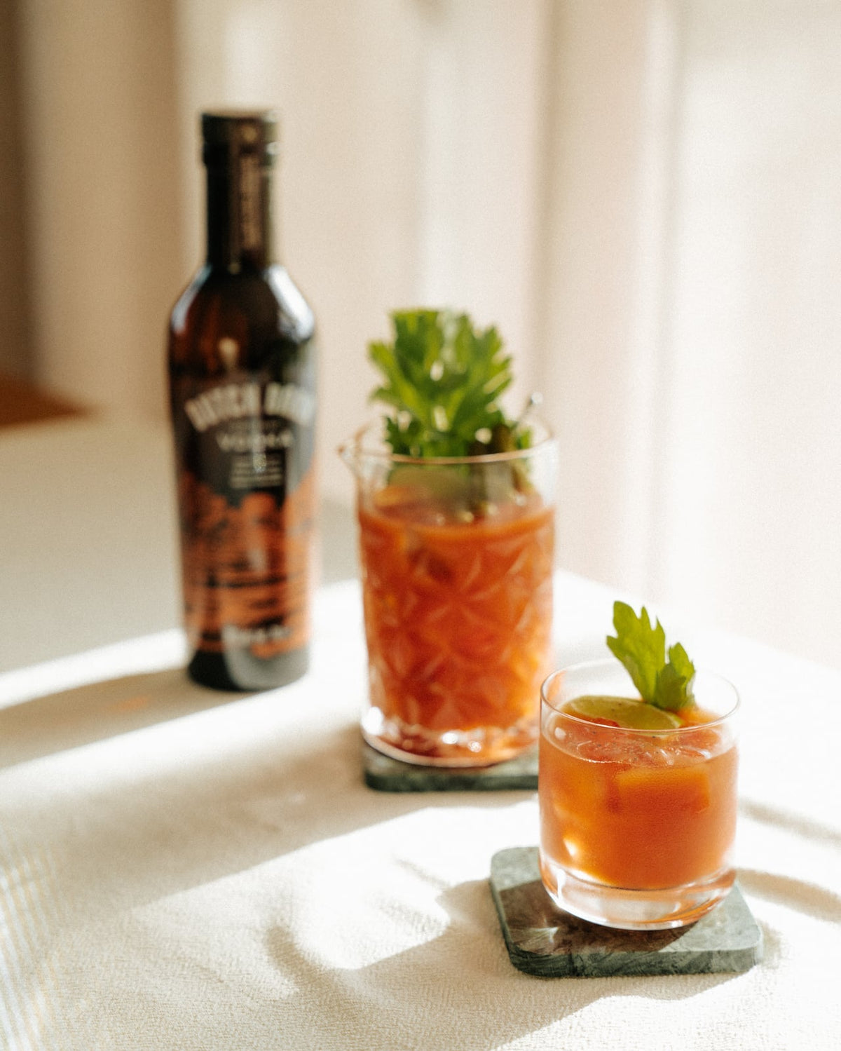 Heb je extra tijd of wil je je Barn Mary meer karakter geven? Experimenteer dan met je tomatensapmix. In Chloés favoriete mix combineer je: 175 ml tomatensap, 5 ml mezcal, 5 ml worcestershiresaus, 1 dash sojasaus, 1/2 koffielepel gochujang, een draai van de pepermolen, paprikapoeder en selderijzout.